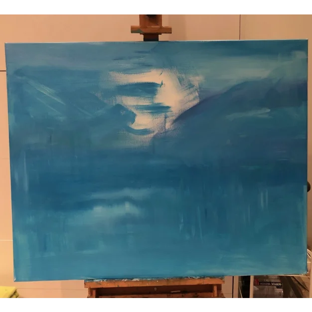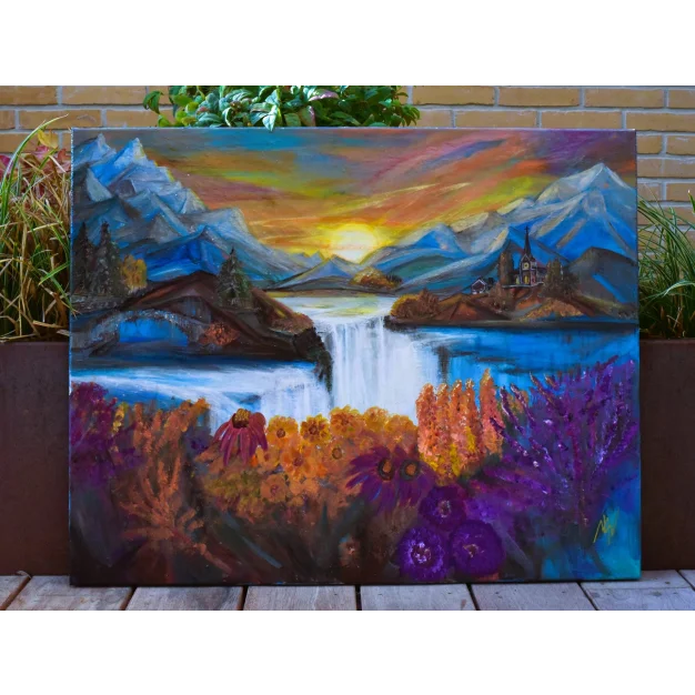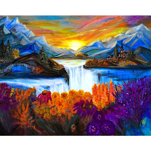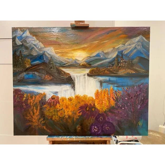 "Autumn Falls" is a picturesque painting that combines elements of abstract landscape, contemporary art, and impressionistic landscape styles. The artwork showcases a serene autumn sunset with the sun gently setting between mountains, casting warm tones across the scene.