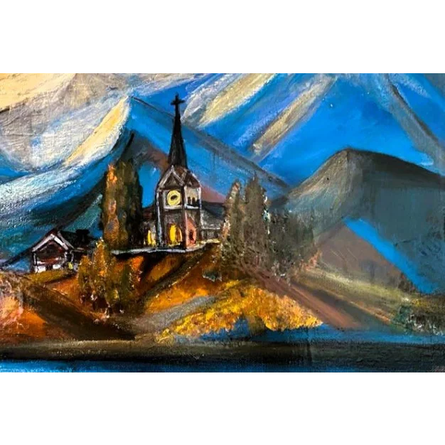 On the right side, a mountain reef stands tall, adorned with a charming church and chalet. These structures, painted with a modern touch, add a sense of familiarity and human presence to the natural landscape. The interplay of light and shadow on the mountains adds depth and realism to the composition.