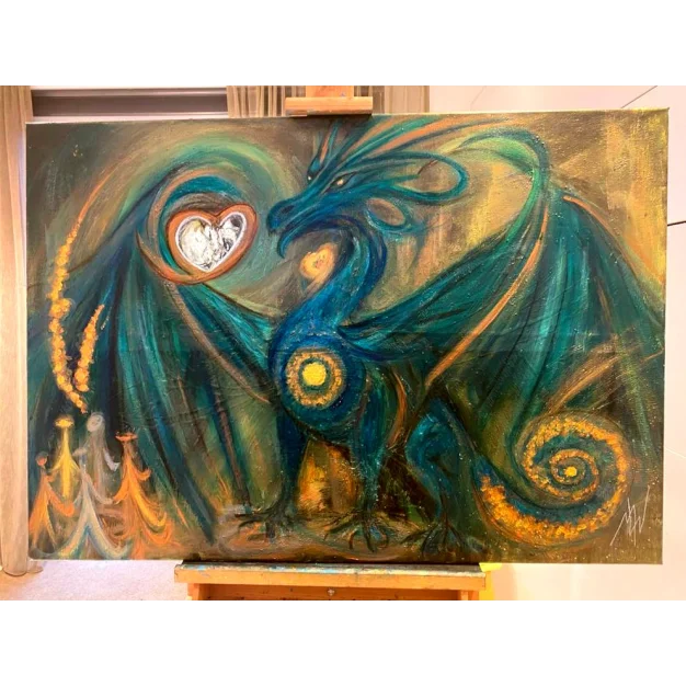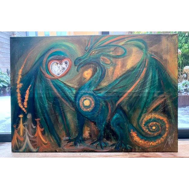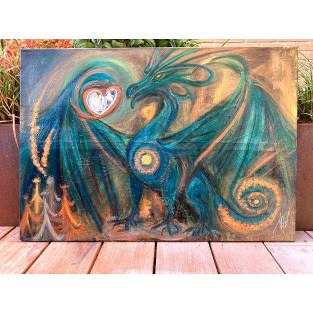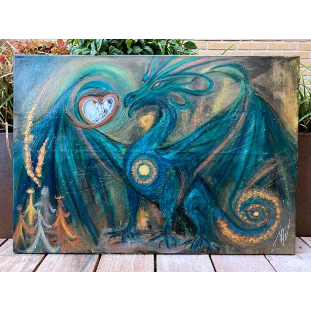 "Emerald: Heartflight" invites viewers into a realm where mythical grace meets the limitless power of connection. The heart-shaped wings symbolize not only the dragon's unique majesty but also the profound unity that resonates through the shared energies of dragon and master. This acrylic masterpiece captures the essence of love and collaboration, weaving a visual narrative of boundless harmony.