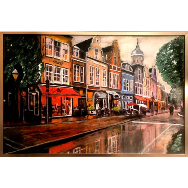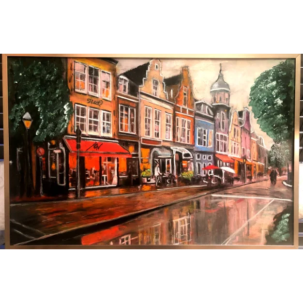 “Utrecht Today” depicts a city street adorned with rain puddles in the Dutch tradition. Light silver and orange tones dominate the scene, infused with the influence of grocery art and Dutch-Flemish aesthetics. Colorful street murals, reminiscent of Agfa Vista hues, merge with Emilia Wilk's style, creating a captivating urban landscape. The 3:2 aspect ratio provides a panoramic view of this Dutch cityscape.