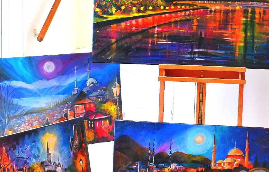 "Byzantion": In this homage to Istanbul, IM'Art pays tribute to the city's rich history by portraying the timeless icon of Hagia Sophia on the right. Majestic mountains create a breathtaking backdrop, seamlessly blending the city with the beauty of nature. The canvas captures reflections of the ancient city, where water mirrors minarets and mountains. Starting with a charcoal sketch, the artwork comes to life as layers of acrylic paint blend in a vibrant symphony, vividly reflecting Byzantion's diverse spirit. Detailed vibrancy emerges with acrylic paints and oil pastels, encapsulating the essence of this historic city. Explore the layers of 'Byzantion,' a cityscape painted with dreamlike hues spanning centuries.