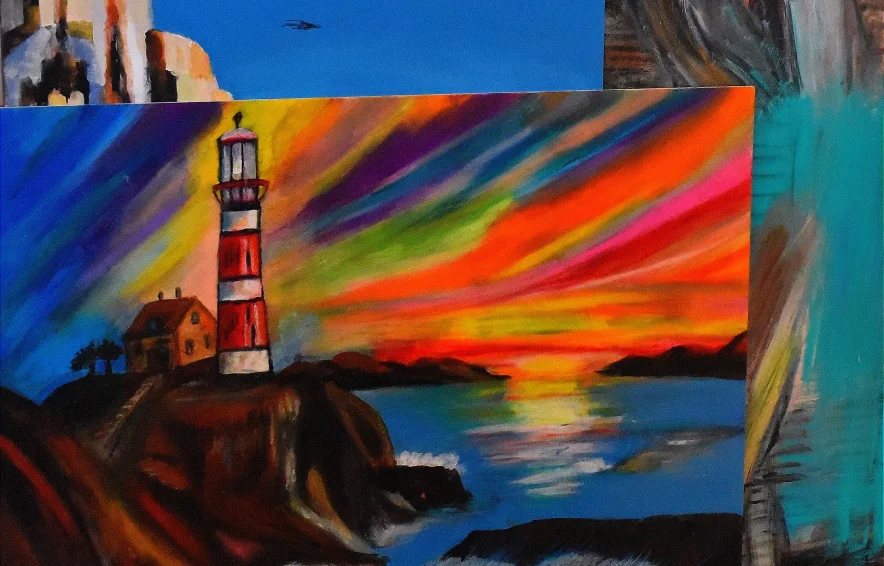 Witness the enchantment of a coastal sunset as a majestic lighthouse becomes a beacon, casting a brilliant spectrum across the serene sea. This artwork invites you to experience the magic of transitioning from day to night in a radiant display of colors.
