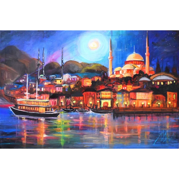 Na minha pintura 'Byzantion,' faço uma homenagem a Istambul, retratando o ícone atemporal da Hagia Sophia à direita. Montanhas criam um pano de fundo majestoso, mostrando a cidade em meio à natureza. A tela captura reflexos da antiga cidade, com a água espelhando minaretes e montanhas.